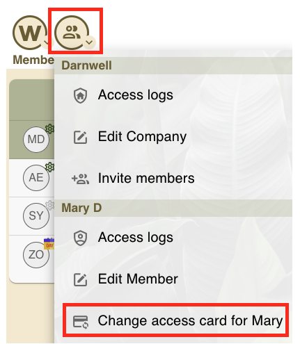 Find the member you want to edit and click Change the acces card for … from the action menu.