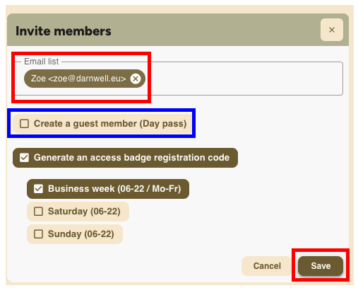 Choose to invite them as a Regular member or a Guest (Day pass).