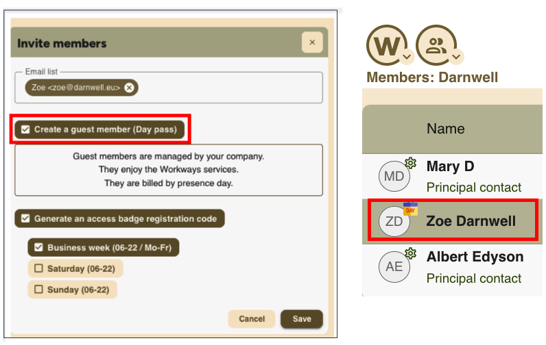 If you regularly receive the same visitor or host them for a short period, you must register them in your company’s member list as a Day Pass (guest member).