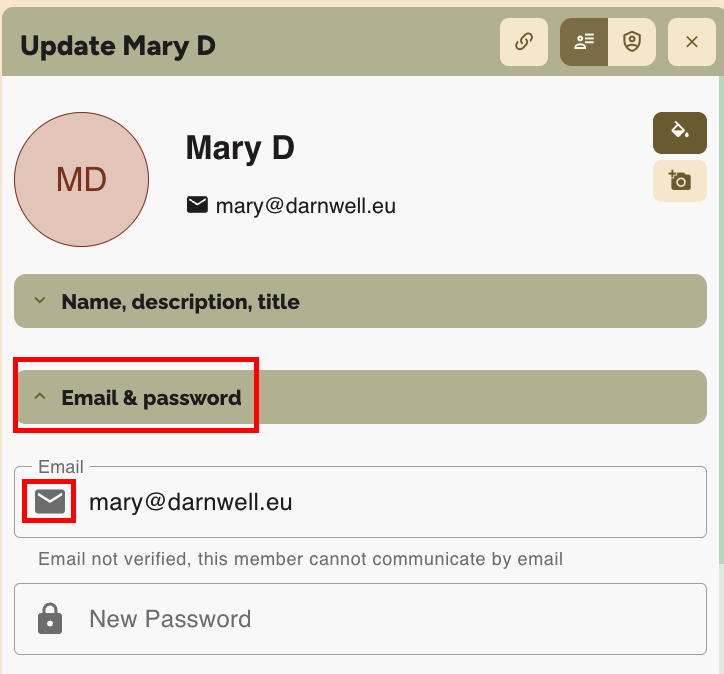 - Displayed message: Email not verified, this member cannot communicate by email
