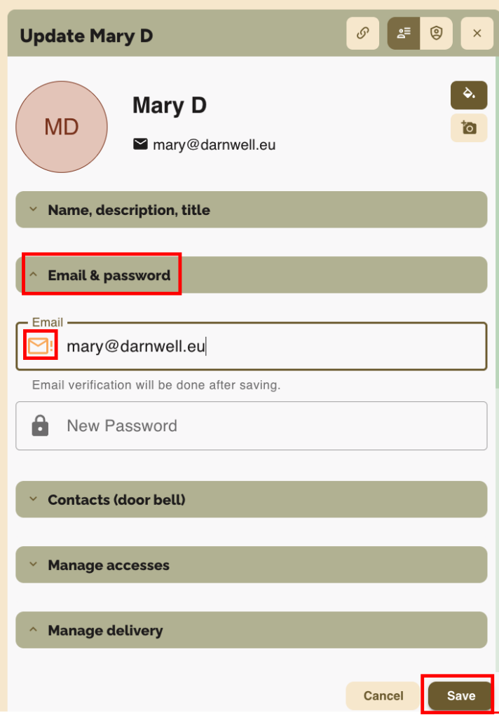 - Displayed message: Email verification will be done after saving.