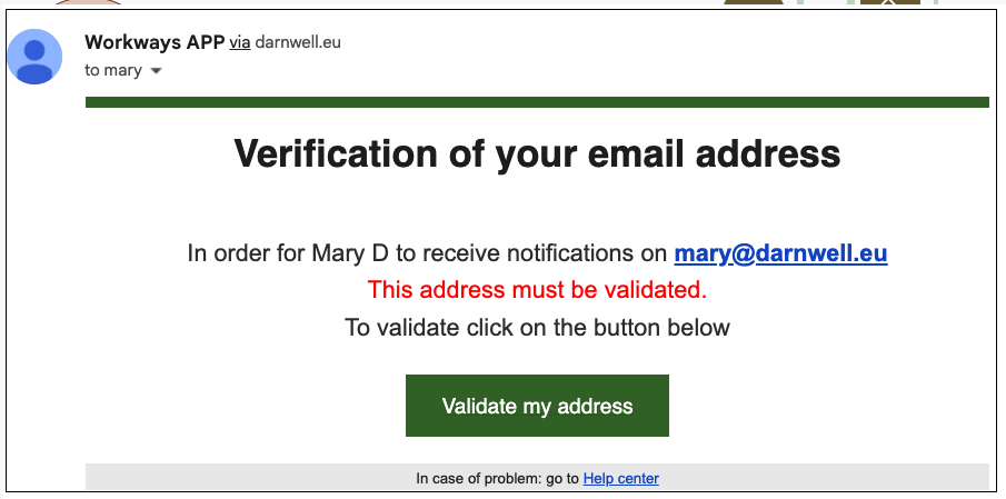To do this, simply click the Validate my address button in the email sent to you from the Workways app.